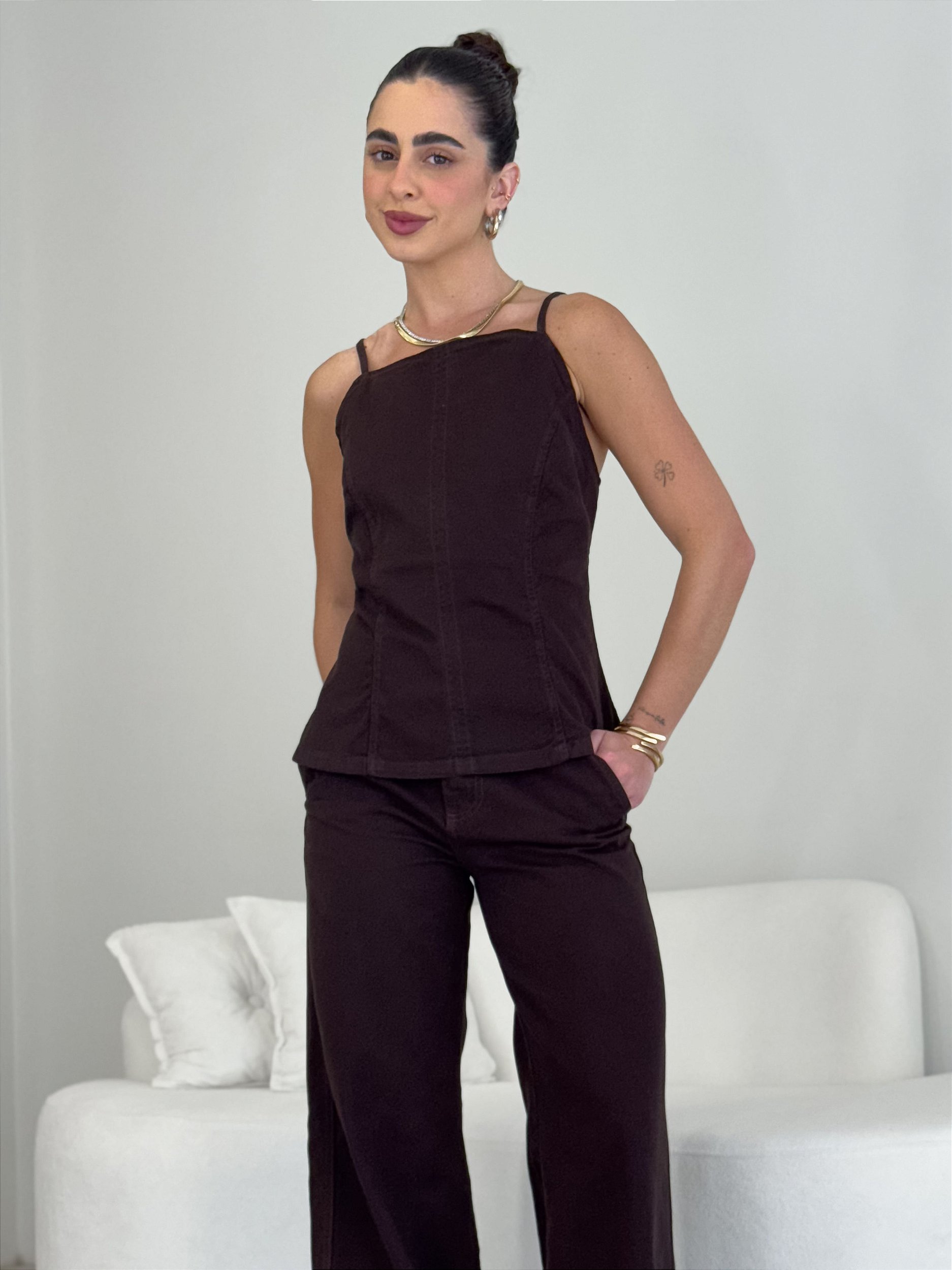 Blusa jeans moderna e estruturada, confeccionada em 100% algodão, garantindo conforto e respirabilidade. Possui modelagem ajustada ao corpo com recortes que valorizam a silhueta. O decote reto traz um toque minimalista e sofisticado, enquanto as alças finas deixam a peça feminina e versátil para composições casuais ou mais elaboradas. Nas costas, o zíper exposto adiciona estilo e facilita o vestir.