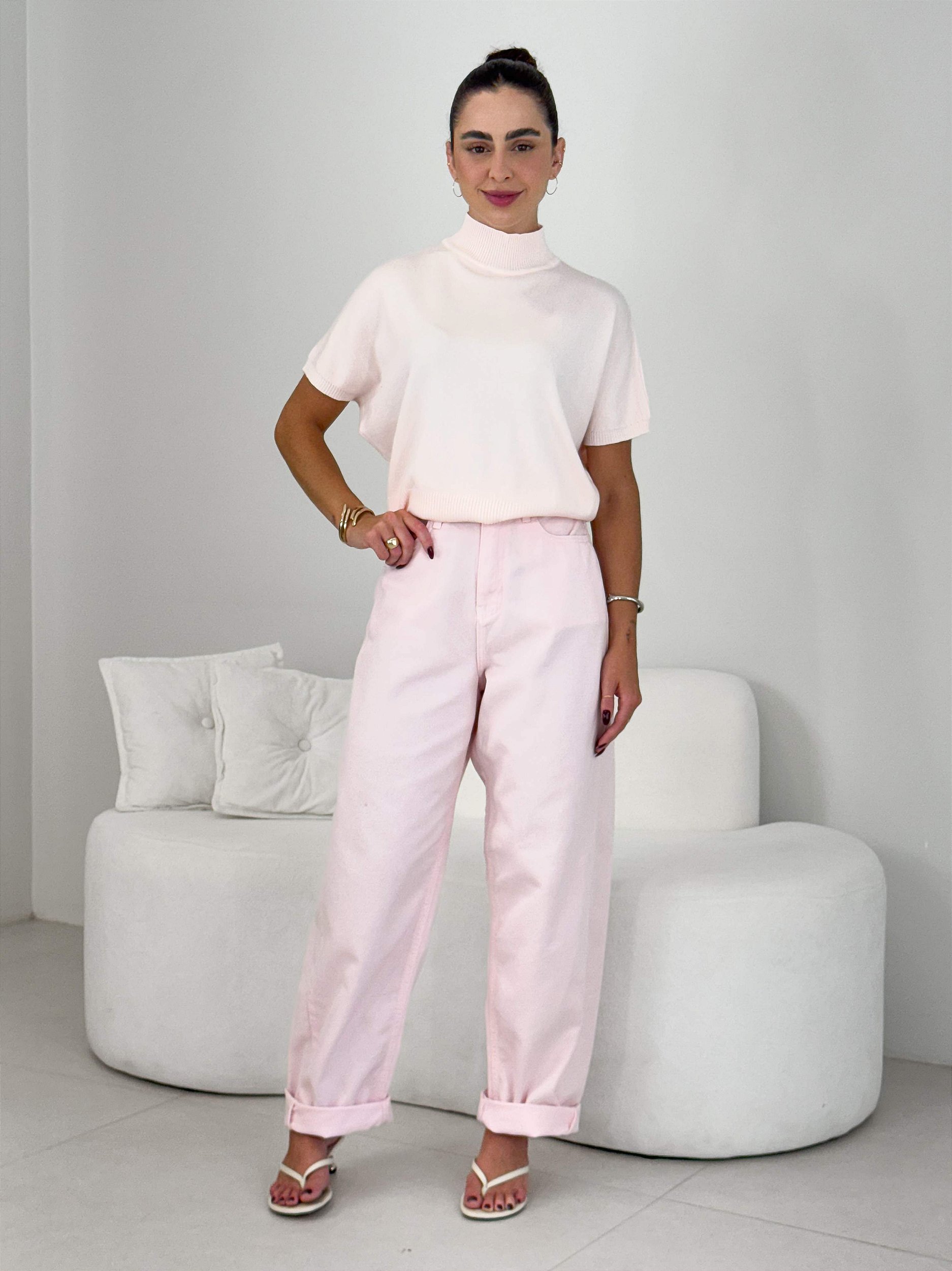 Combine a blusa com calças de cores claras para um visual moderno e clean ou com jeans para uma produção casual rápida. Para cuidados, prefira lavagem à mão ou ciclo delicado para preservar o toque e evitar deformações.