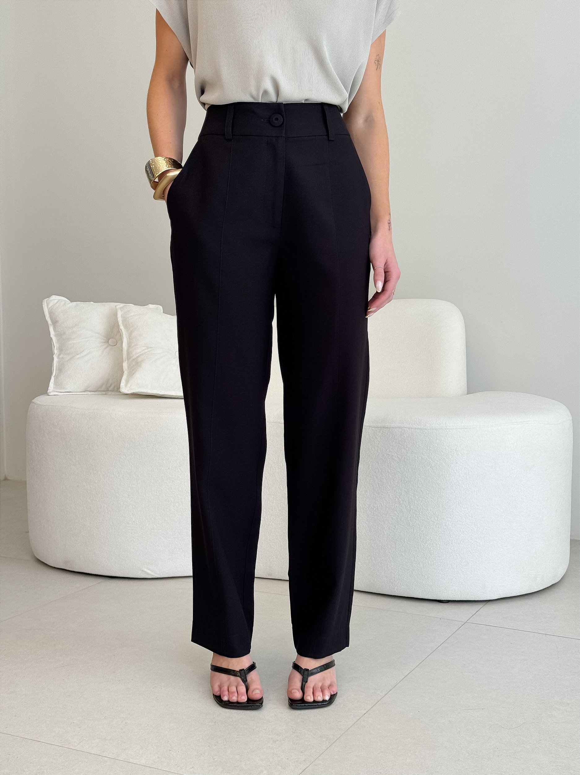 Calça reta feminina em alfaiataria, confeccionada em tecido marrant, que combina sofisticação e versatilidade em uma única peça. Possui cintura alta que alonga a silhueta, botão forrado para acabamento delicado e recorte estruturado que valoriza o caimento. O modelo clássico de alfaiataria garante elegância atemporal, ideal para composições profissionais ou modernas no dia a dia.