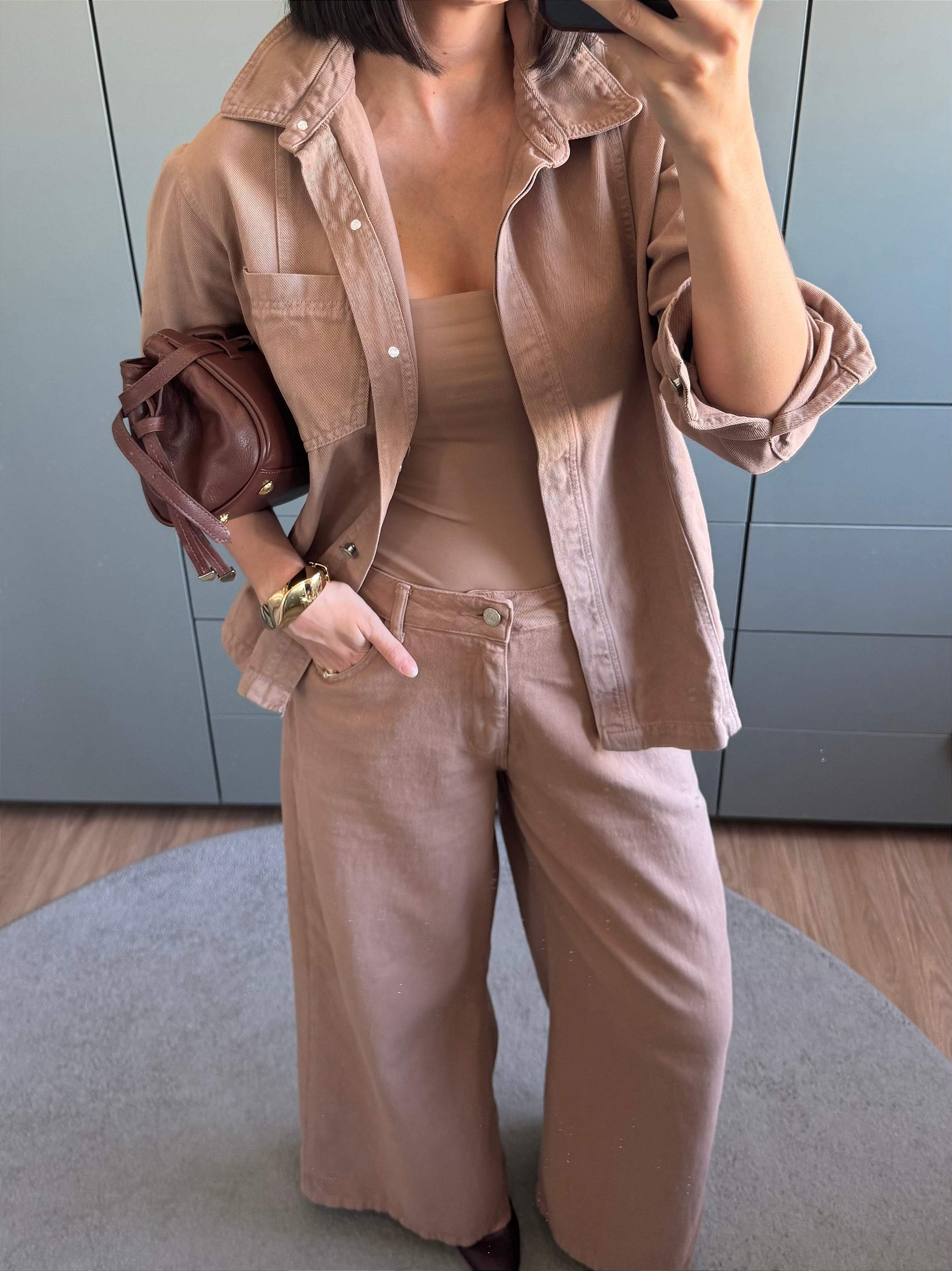 Combine a camisa jeans marrom claro palazzo com botas de cano alto para um visual poderoso. Para um toque moderno, adicione brincos de argola grandes e acessórios em tons terrosos. Use a manga dobrada para um ar mais despojado e casual. Pode ser usada tanto em eventos diurnos quanto em passeios à noite, trazendo versatilidade ao guarda-roupa.