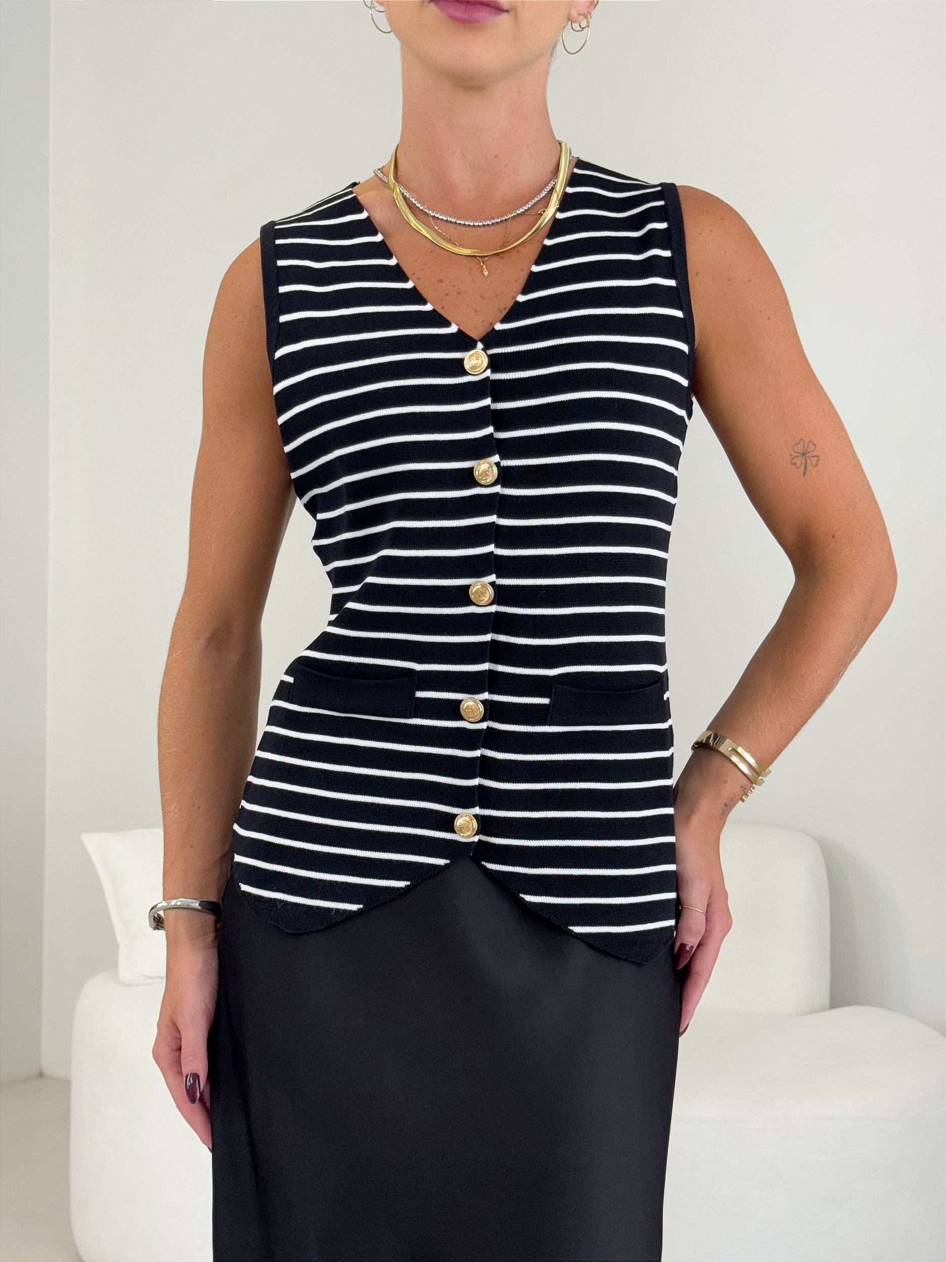O colete de tricot é aquela peça curinga que eleva qualquer produção com charme e sofisticação. Possui modelagem ajustada ao corpo, valorizando a silhueta sem ficar colado, garantindo conforto e elegância no uso. Os botões dourados trazem um toque clássico e refinado, deixando a peça ainda mais especial.