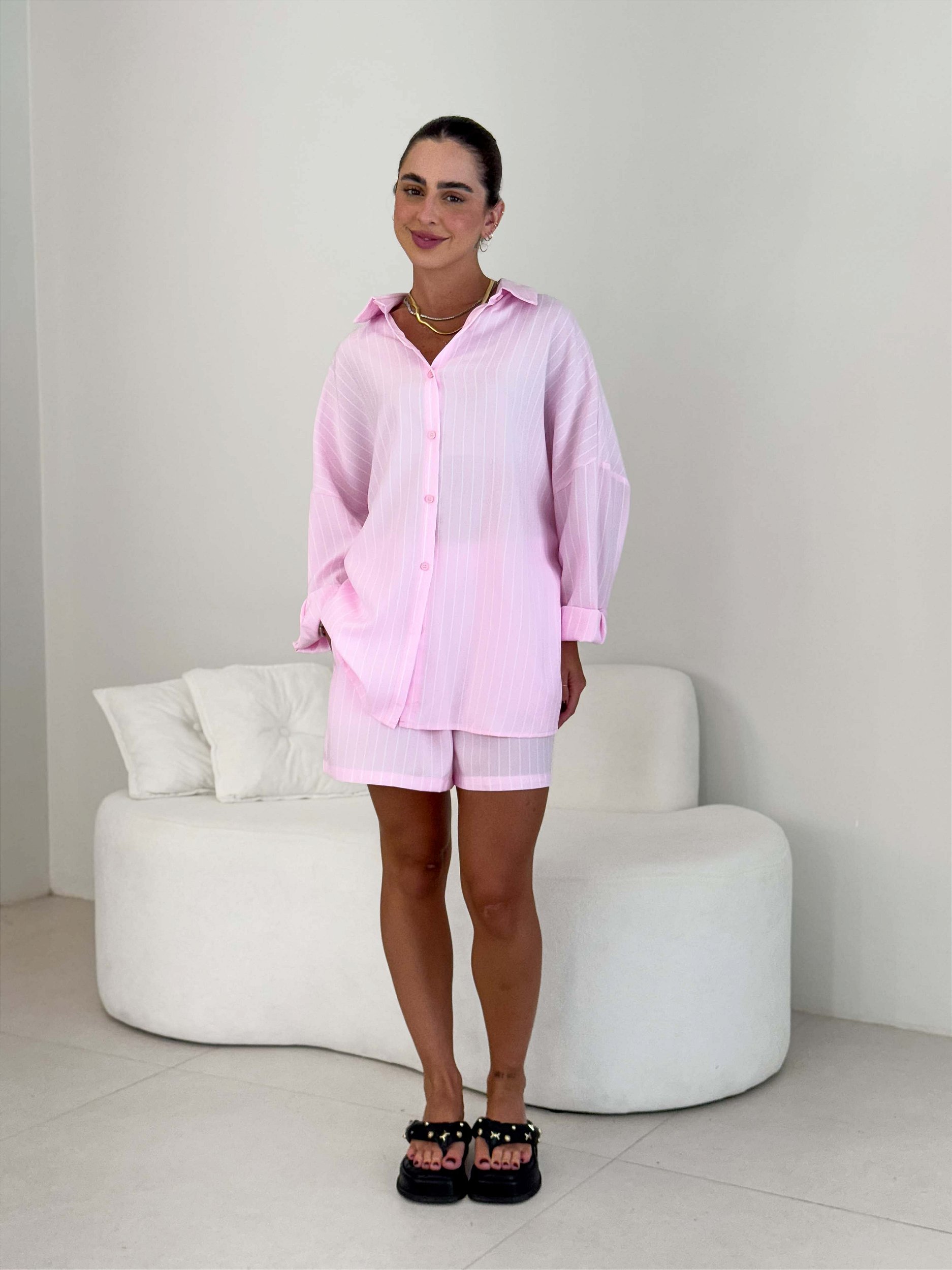 Conjunto prático com camisa oversized e shorts confortável para o dia a dia. Leveza e estilo em tecido listrado.
