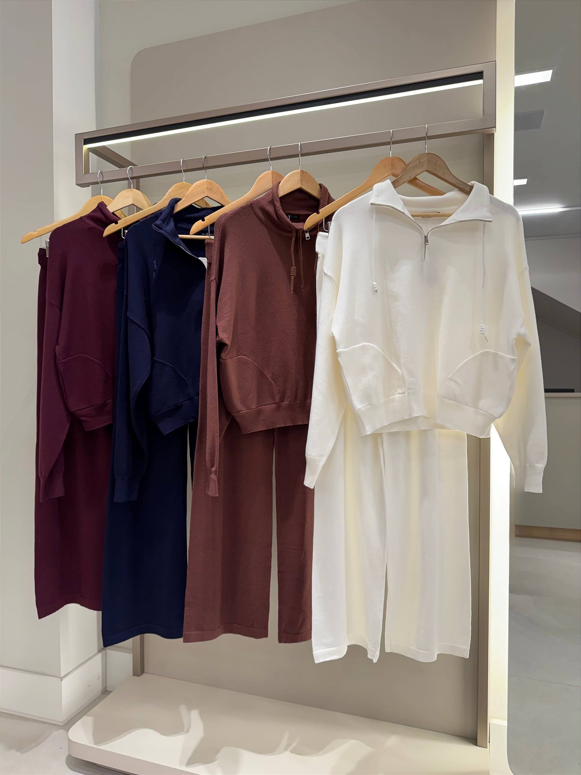 Conjunto com blusa e calça em tricot, oferecendo conforto e estilo para o dia a dia.