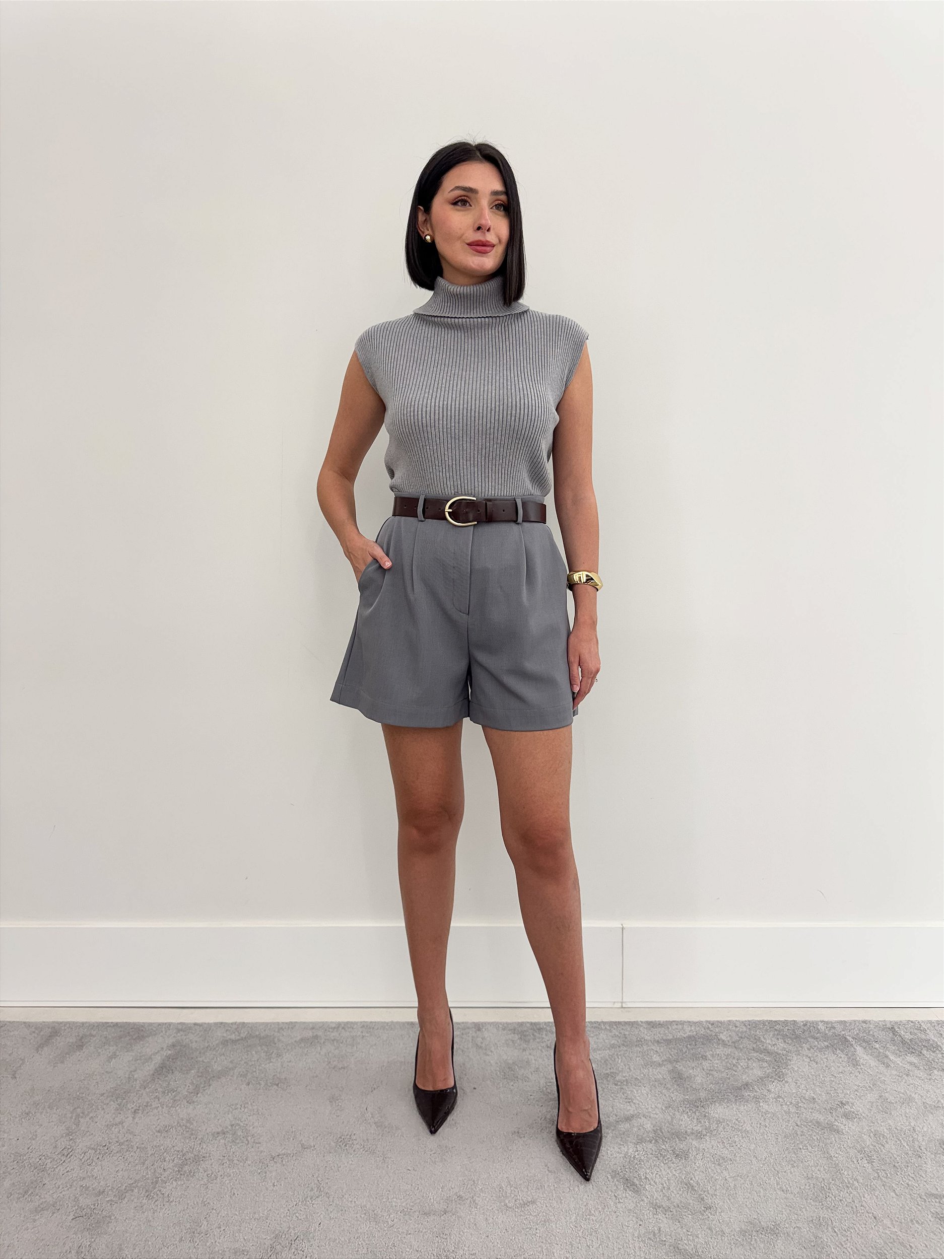 Regata feminina em tricot canelado com gola alta e toque macio de cachemir, perfeita para conforto e estilo.