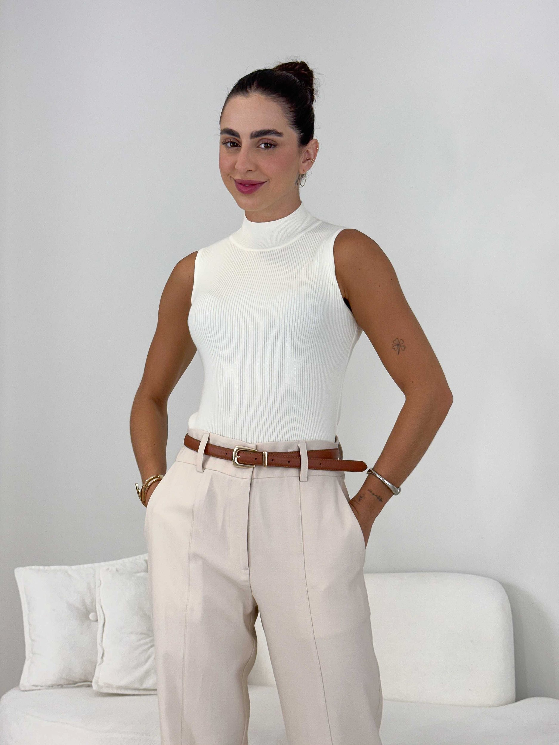 Confeccionada em tricot leve com toque macio de cachemir, essa regata oferece conforto e estilo ajustado ao corpo.