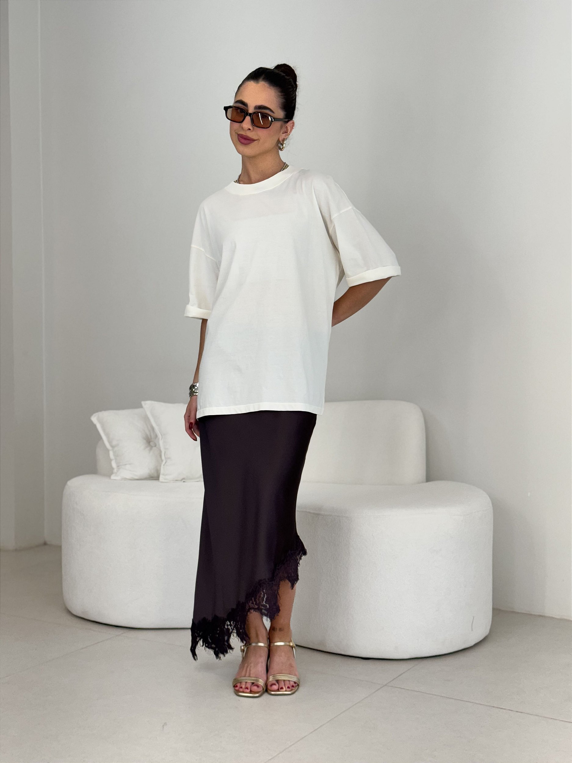 A cintura possui elástico embutido, garantindo conforto absoluto sem interferir na estética da peça. O grande destaque fica por conta da barra assimétrica adornada com renda chantilly, que traz delicadeza, sofisticação e um charme único ao visual.