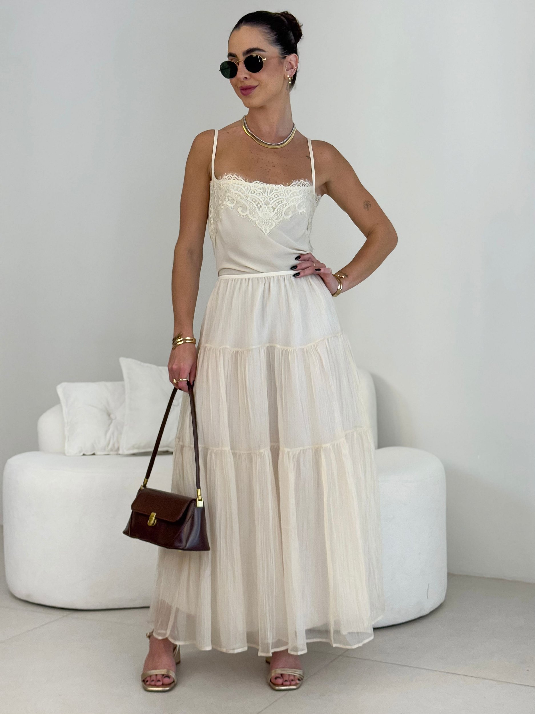 Saia midi fluida confeccionada em chiffon leve e delicado, com caimento suave e movimento encantador.