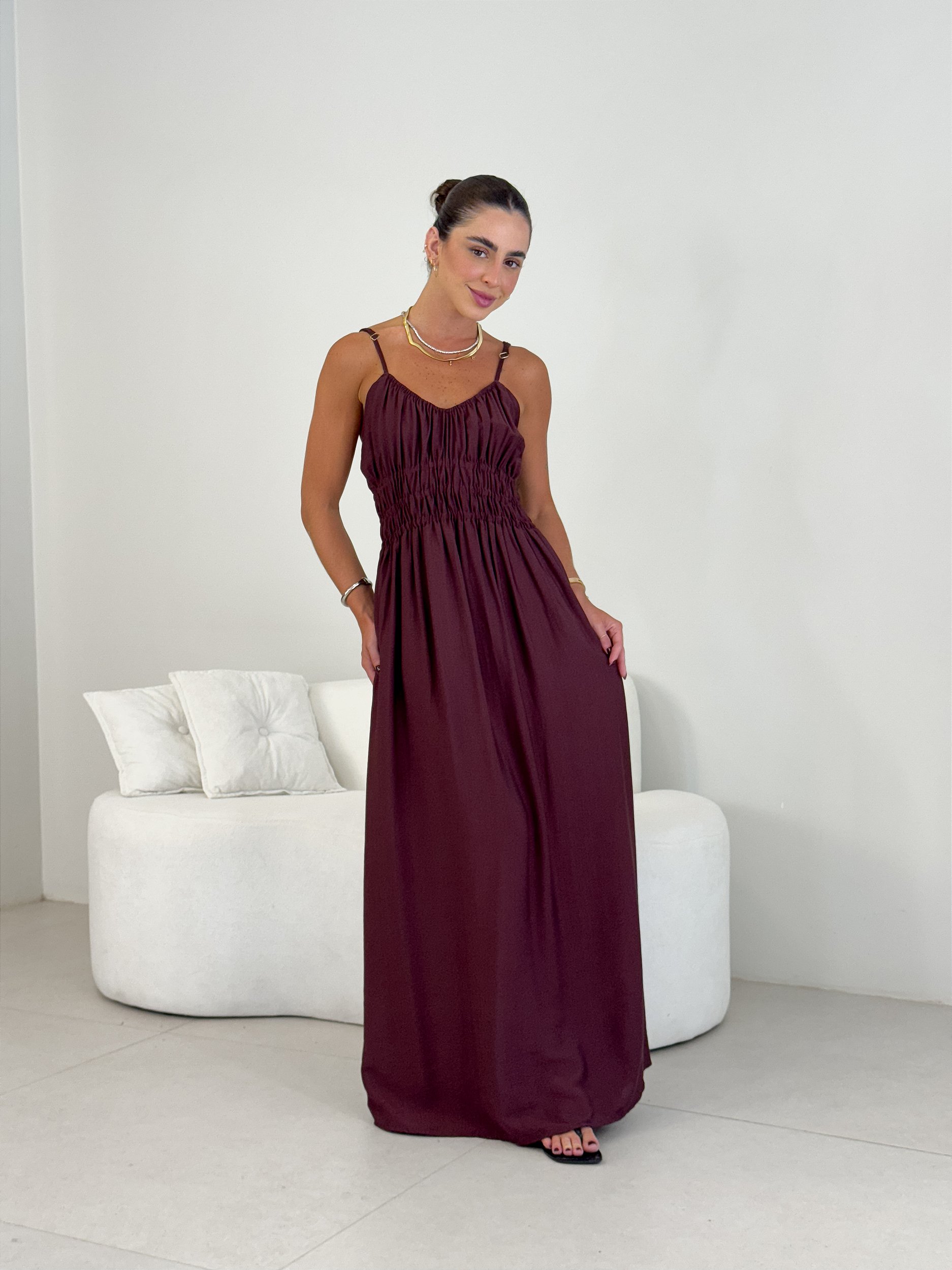O Vestido Amélia é aquela peça leve, feminina e extremamente confortável, perfeita para acompanhar você em diferentes momentos do dia. Confeccionado em viscose glow, possui um caimento fluido que valoriza o corpo sem marcar.